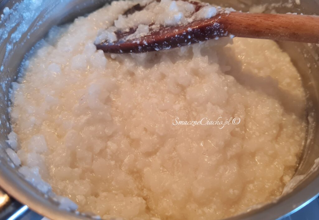 1. Do garnka wlej maślankę i wodę oraz wsyp ryż. Doprowadź do wrzenia i gotuj na średniej mocy palnika mieszając co jakiś czas. Pod koniec gotowania, gdy ryż zacznie się kleić, zmniejsz płomień pod garnkiem. Ryż będzie gotowy po ok. 30 minutach, gdy wchłonie płyn i będzie klejącą masą.