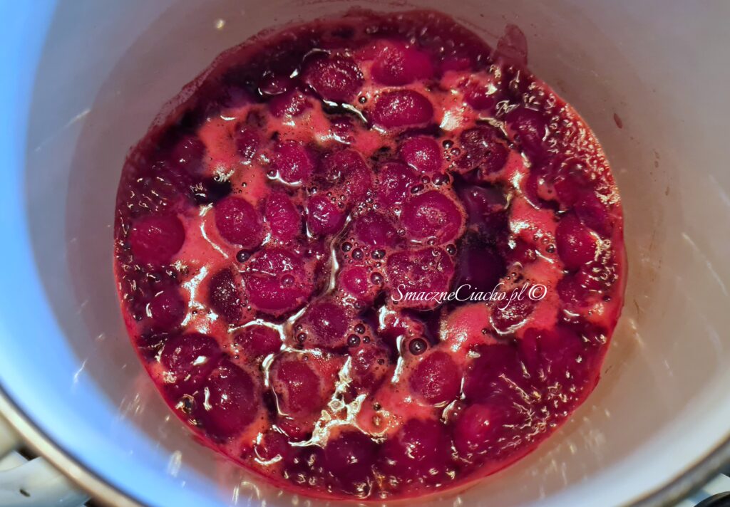 3. Gdy wiśnie puszczą sok, zaczną się rozpadać, a cukier nie będzie już widoczny, odstaw garnek z palnika. Do wiśni dolewaj powoli mąkę z wodą szybko mieszając całość. Ustaw jeszcze na chwilę na palniku i mieszaj aż troszkę bardziej zgęstnieje. Odstaw na 5 minut.