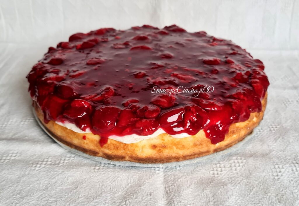4. Ciasto wyjmij z lodówki i wyłóż na wierz wiśnie. Odczekaj kilka minut aż wiśnie przestaną parować i wstaw ciasto ryżowe z cynamonowym jogurtem i wiśniami na pół godziny do lodówki.