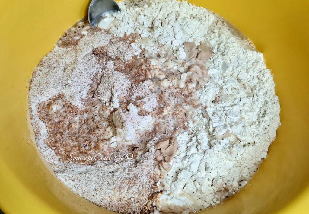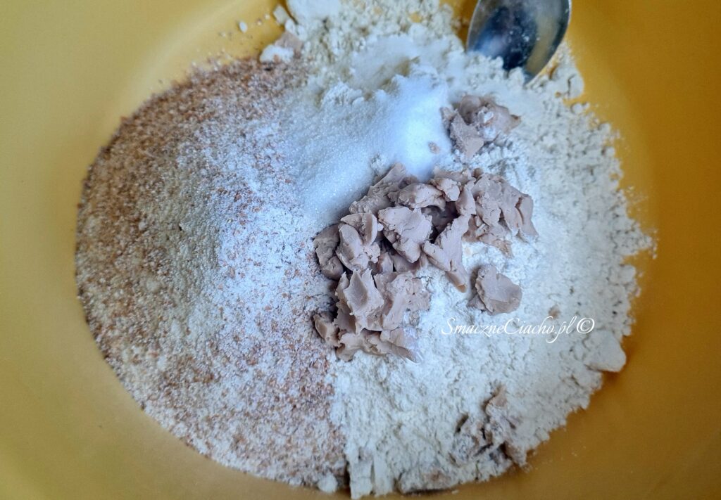 1. Do większej miski wsyp oba rodzaje mąki, cukier, sól, dodaj drożdże i wlej ciepłą wodę.