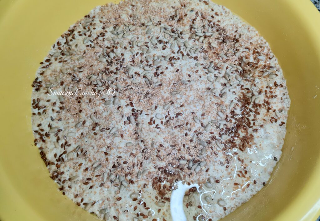 5. Po wyrośnięciu ciasta na chleb dodaj 2 łyżki oleju i ewentualnie wsyp ulubione dodatki (u mnie 2 mniejsze garści ziaren słonecznika łuskanego, 3 garści siemienia lnianego, 1 garść otrębów pszennych).