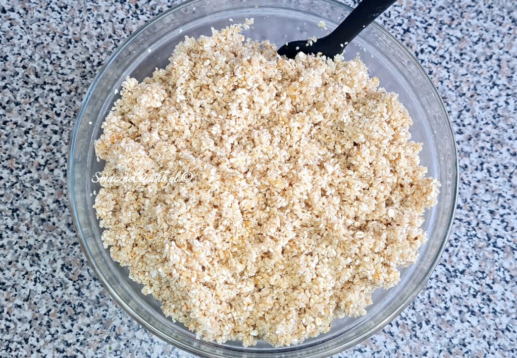 1. Do dużej miski wlej białka oraz wsyp resztę składników. Dokładnie wymieszaj np. łyżką.