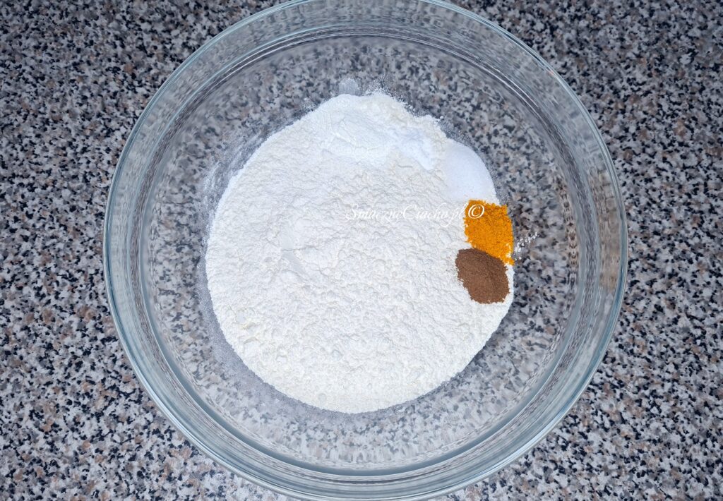 4. W większej misce zmieszaj mąkę, proszek do pieczenia, sodę oczyszczoną, kurkumę i cynamon.