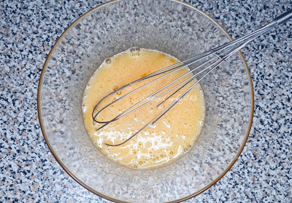 5. Do drugiej, mniejszej miski wsyp cukier, dodaj ekstrakt waniliowy i jajka. Rozkłóć rózgą kuchenną lub widelcem do momentu aż składniki dobrze połączą się.