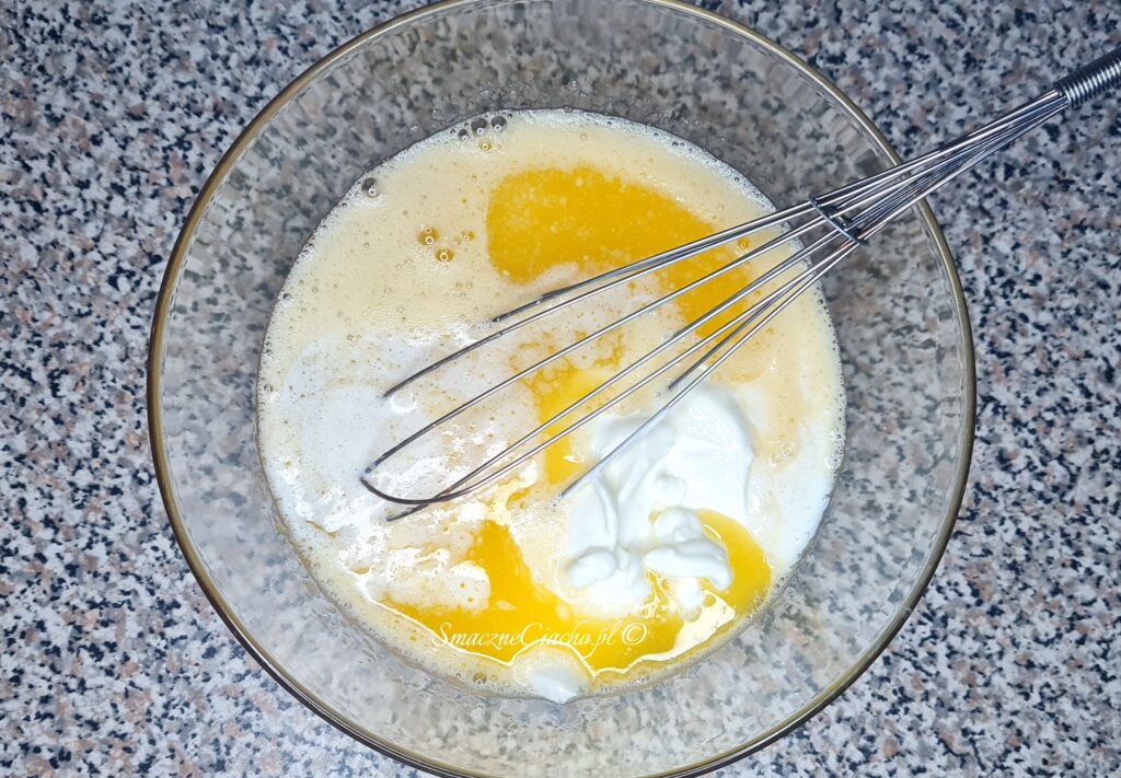 6. Następnie do jajek z cukrem dodaj skyr i rozpuszczone masło w temperaturze pokojowej. Wymieszaj rózgą kuchenną lub widelcem do momentu aż składniki dobrze połączą się.
