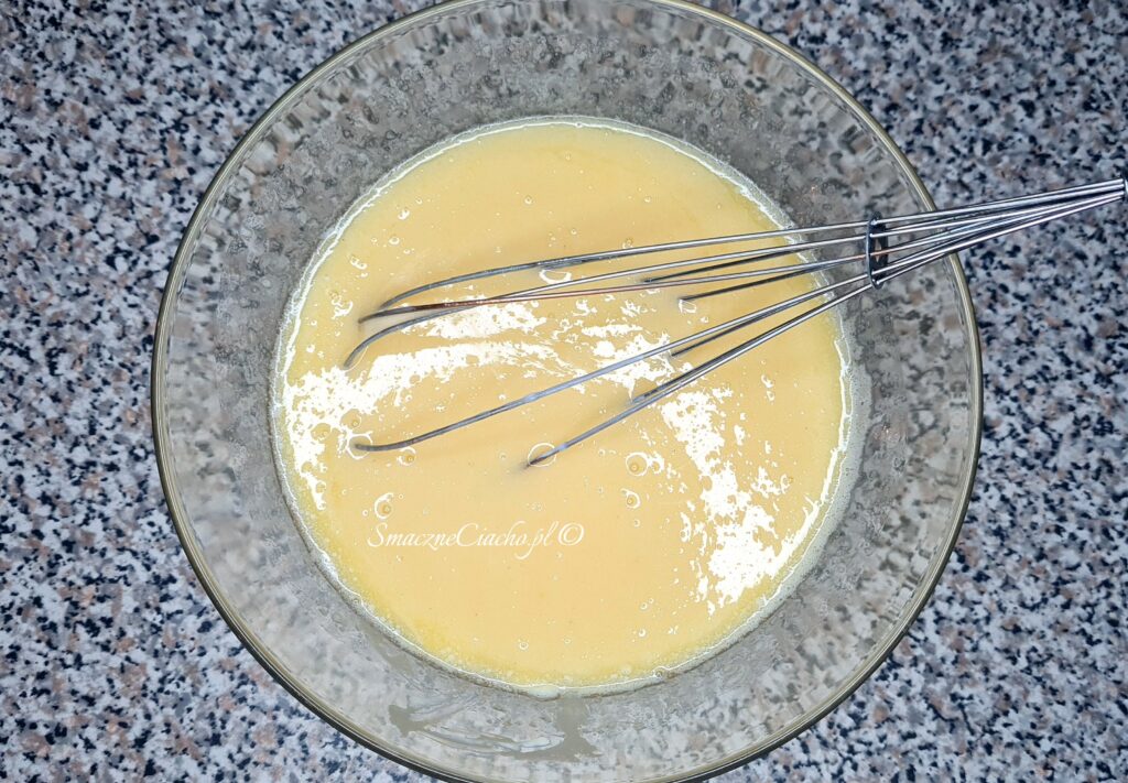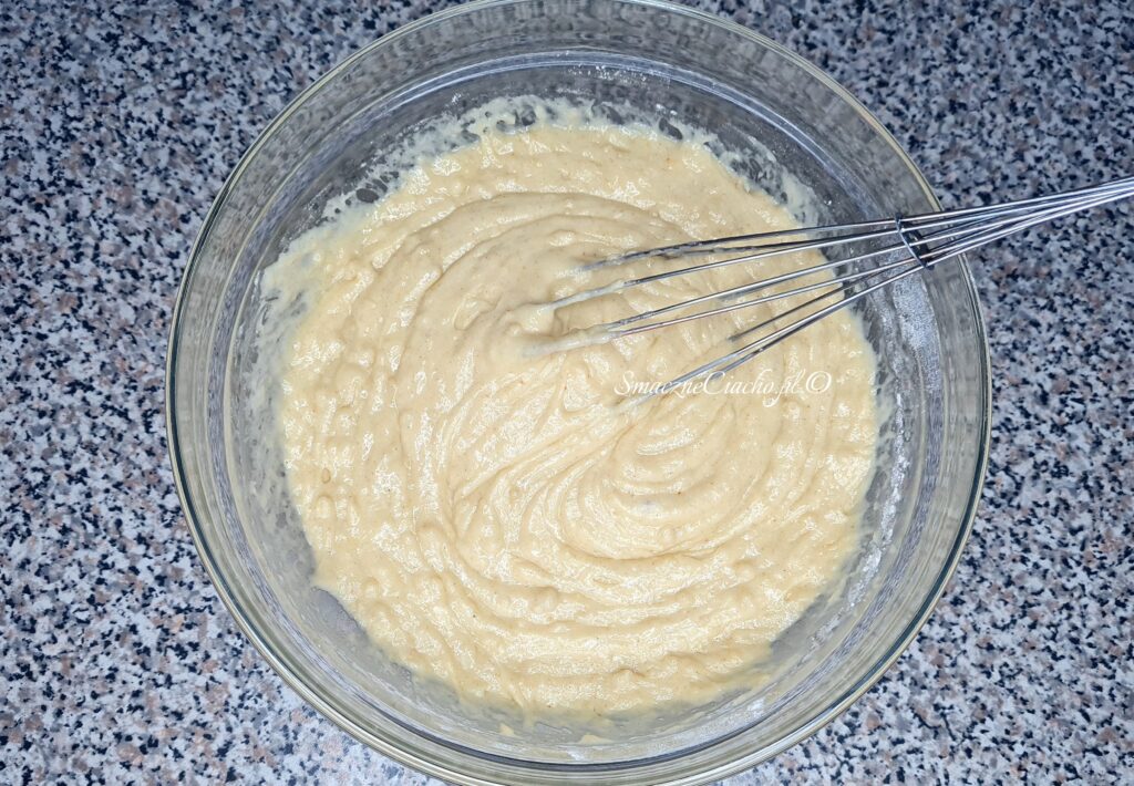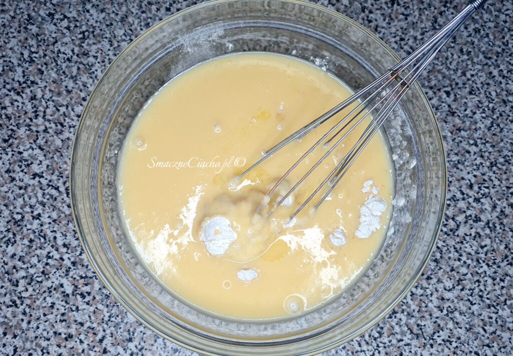 7. Mokrą mieszankę przelej do mąki z dodatkami i wymieszaj rózgą tylko do połączenia.