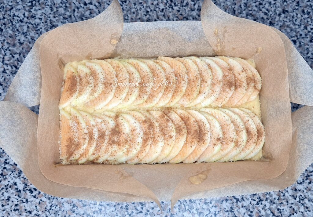 8. Przełóż ciasto do formy, wyrównaj. Na wierzchu ułóż plasterki jabłka, posyp cukrem i cynamonem. Wstaw do nagrzanego piekarnika i piecz ok. 50minut, do suchego patyczka.