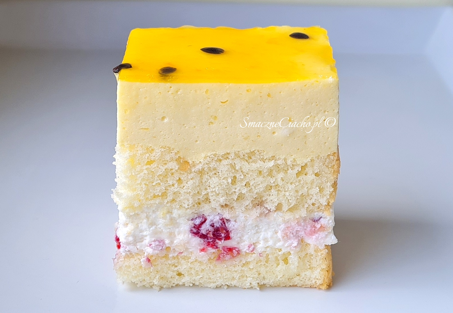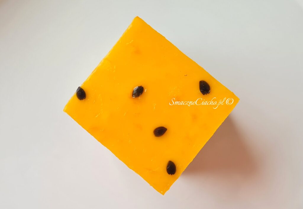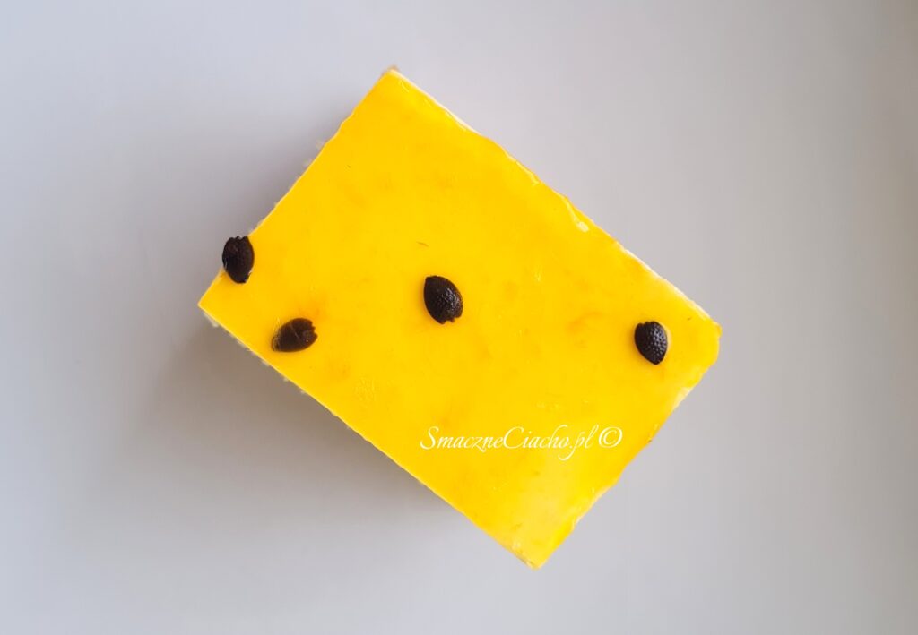 4. Ciasto wyjmij z lodówki i udekoruj pulpą z marakui i mango (ja użyłam łyżki aby mieć kontrolę nad ilością pestek w danym miejscu).