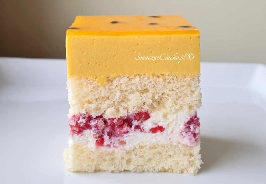 To lekkie ciasto na jasnym biszkopcie z bitą śmietaną, malinami, delikatnym musem z mango, dopełnione cieniutką warstwą wyrazistej marakui. U mnie z dodatkiem chrupiących pestek. Aż trudno poprzestać na jednym kawałku. Moje ciasto „Egzotyczna Malina” po prostu znika ze stołu w mgnieniu oka.