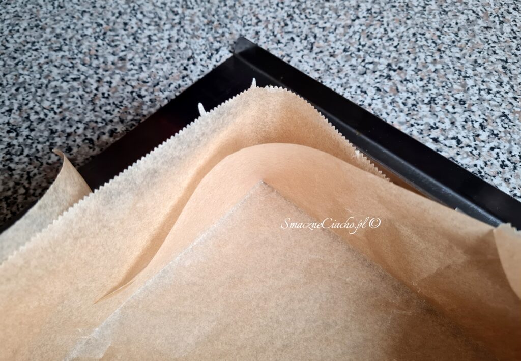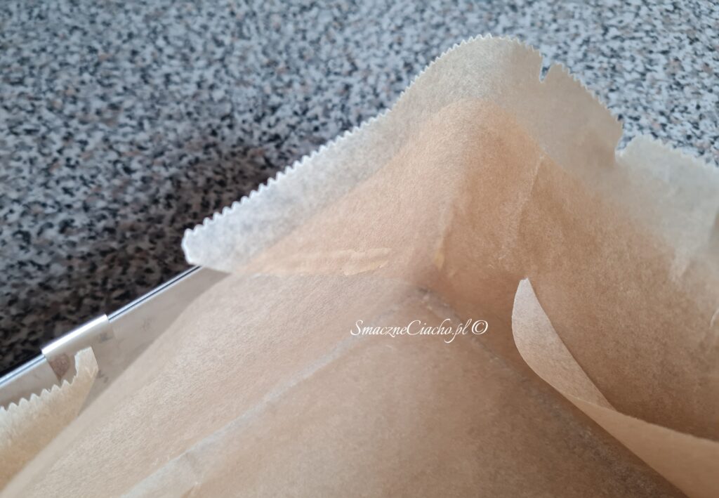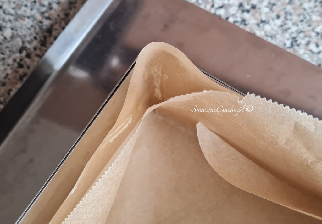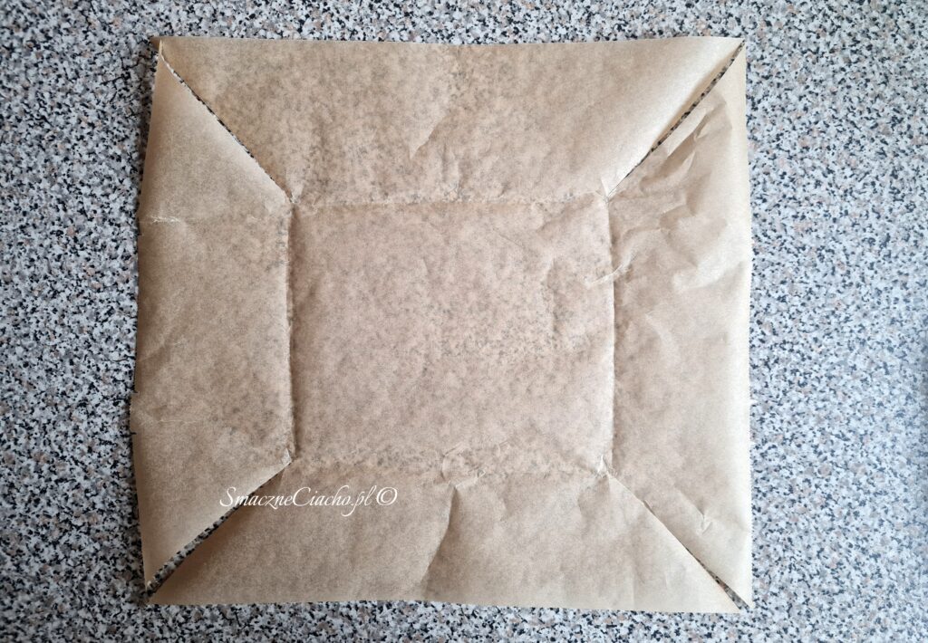 1. Formę, w której będzie pieczone ciasto odwróć do góry spodem, nałóż na wierzch arkusz papieru do pieczenia i zagnij go na brzegach. Powstanie prostokąt lub kwadrat, docelowo umieszczony na spodzie formy.