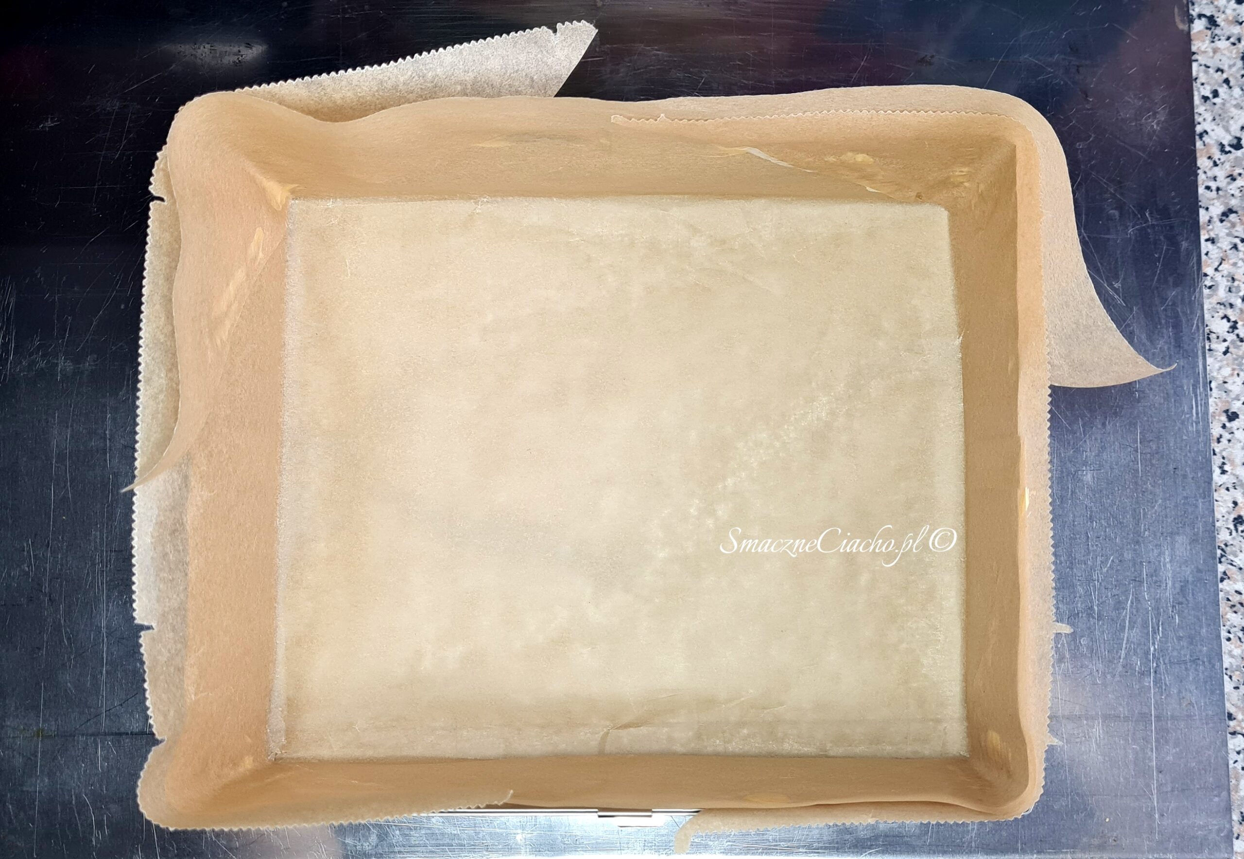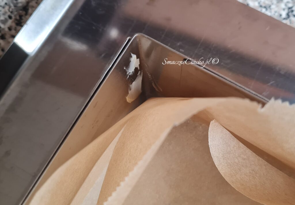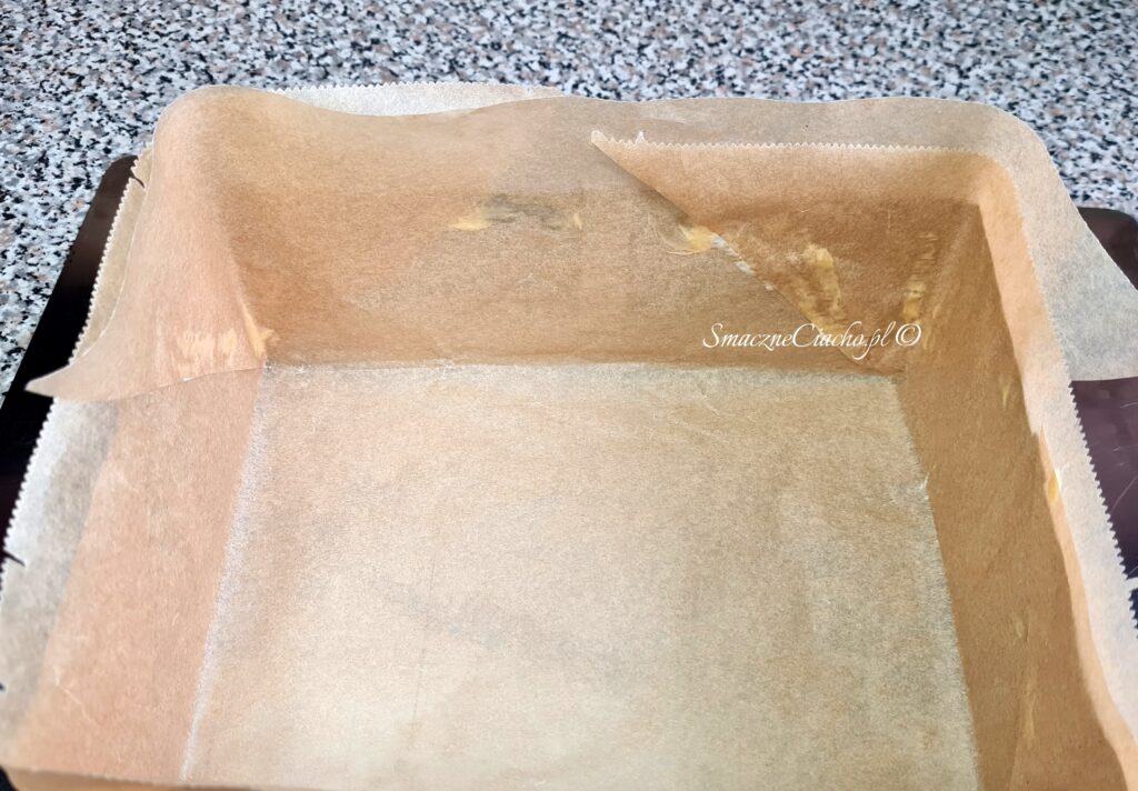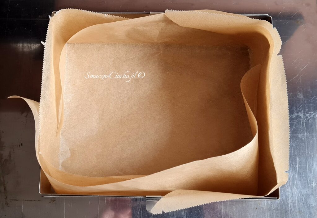 1. Formę, w której będzie pieczone ciasto odwróć do góry spodem, nałóż na wierzch arkusz papieru do pieczenia i zagnij go na brzegach. Powstanie prostokąt lub kwadrat, docelowo umieszczony na spodzie formy.