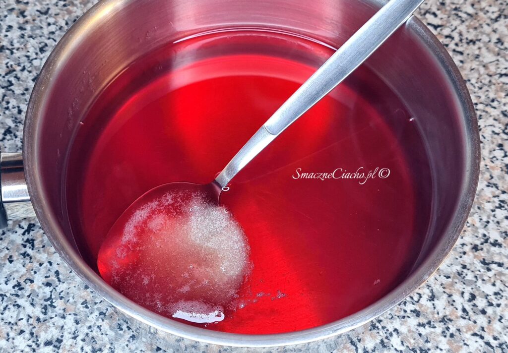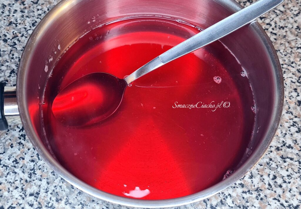 2. Zagotuj 250ml wody i rozpuść w niej pozostałe 0,5 opakowania galaretki malinowej. Następnie dodaj napęczniałą żelatynę i mieszaj przez chwilę do jej rozpuszczenia.