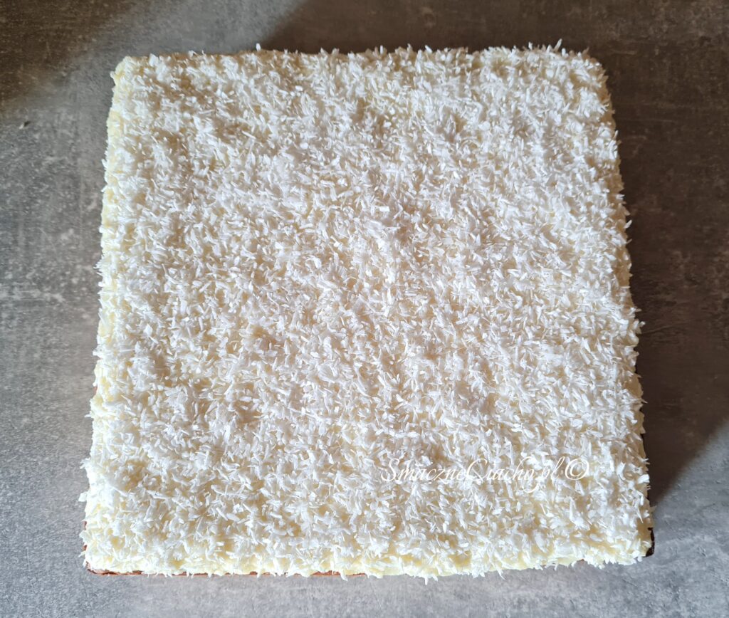 5. Na wierzch wyłóż resztę kremu, wyrównaj i posyp wiórkami przeznaczonymi do dekoracji (nic się nie stanie, jeżeli użyjesz więcej lub mniej wiórków).