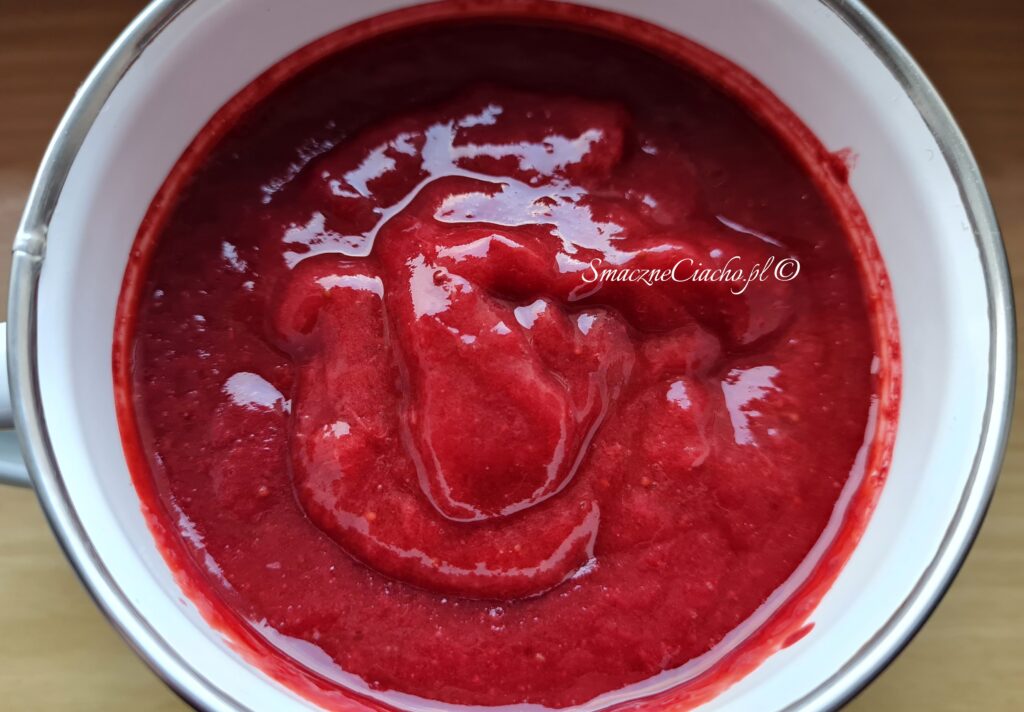 5. Napęczniałą żelatynę rozpuść na małej mocy palnika ciągle mieszając (nie gotuj!) i wymieszaj z puree truskawkowym.