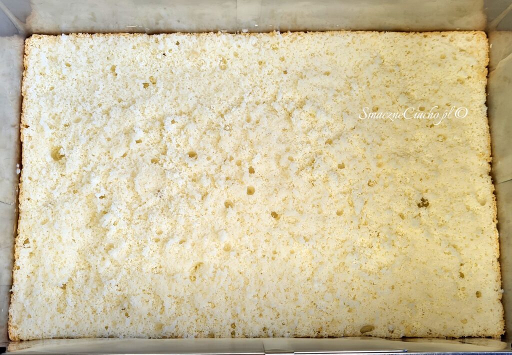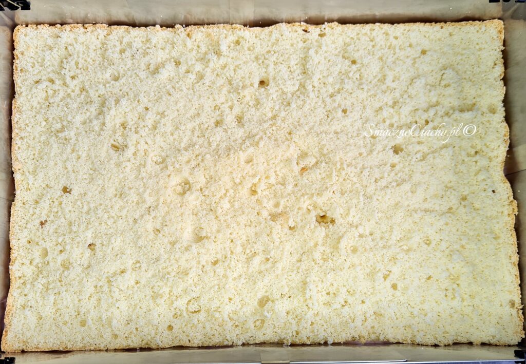 7. Upieczony biszkopt wyłóż na kratkę do studzenia, wyjmij z formy i usuń papier. Pozostaw do całkowitego wystudzenia. (Jeżeli na wierzchu zrobiła się skorupka, zetnij ją nożem aby nie kleiła się do kremu).