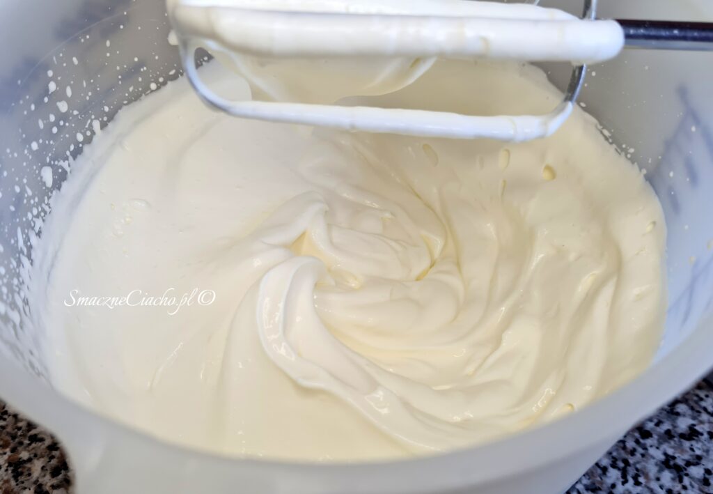 6. Zimną śmietankę kremówkę umieść w wyższym naczyniu, dodaj zimny serek mascarpone i cukier puder. Ubijaj na najwyższej mocy miksera do momentu aż pojawią się wzory po mieszadłach, a całość będzie jeszcze luźna w konsystencji (tzw. podbity krem).
