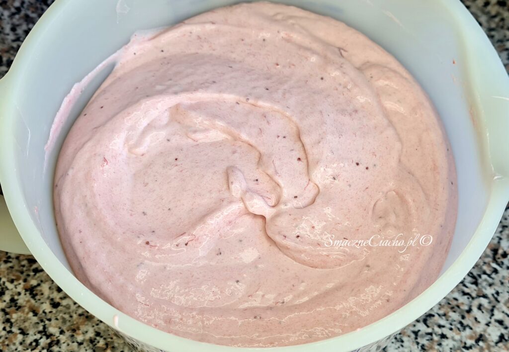 7. Następnie dodaj puree z truskawek w 2 lub 3 porcjach i każdą krótko wymieszaj na wyższych obrotach miksera. Na koniec delikatnie zbierz szpatułką krem ze ścianek i przemieszaj sięgając również dna (dla pewności, że nie pozostaną w kremie jasne smugi).