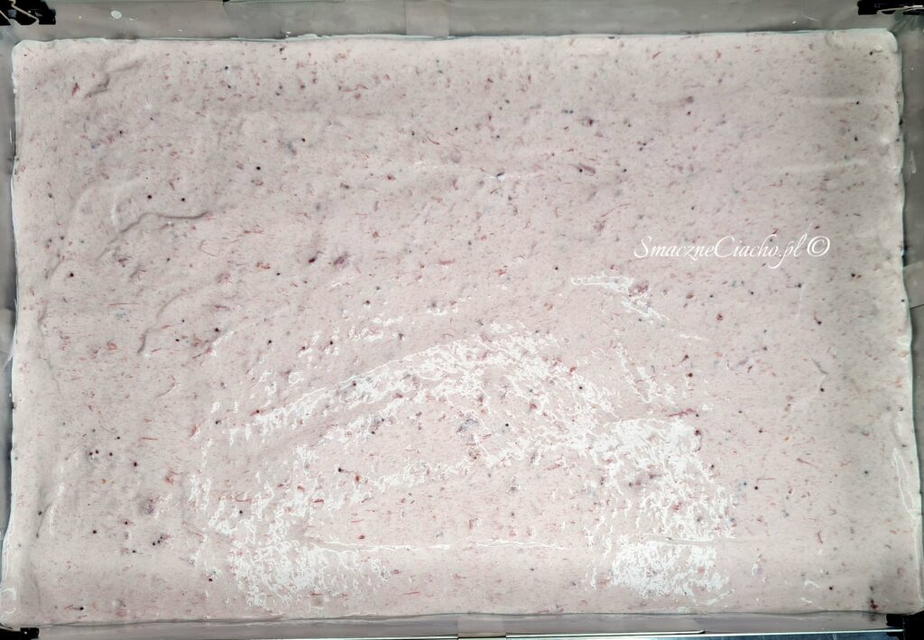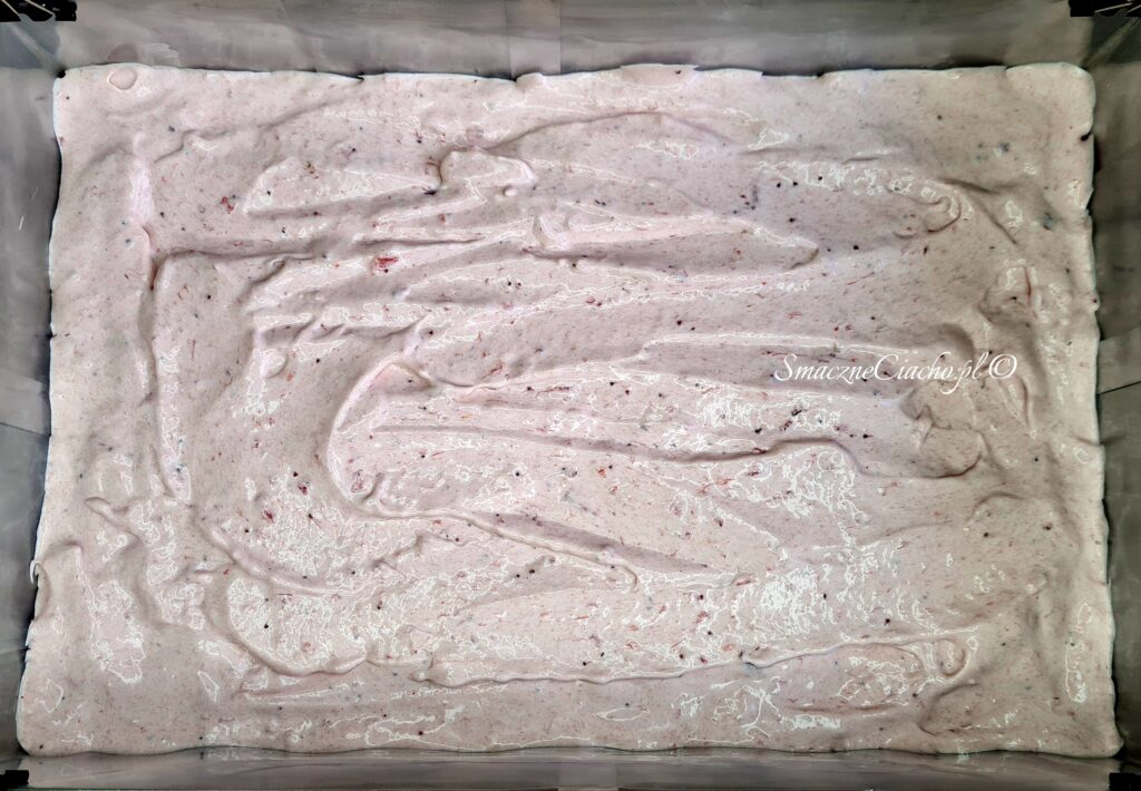 6. Przełóż ciasto biszkoptowe do formy, wyrównaj i wstaw do nagrzanego piekarnika. Piecz ok. 30-40 minut, do suchego patyczka.