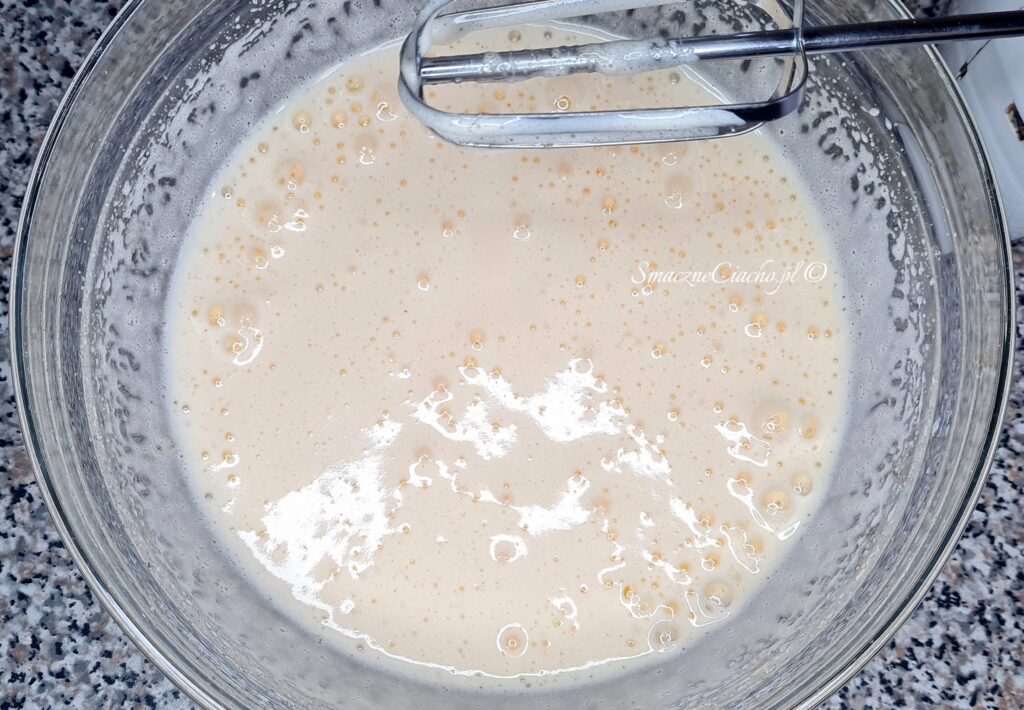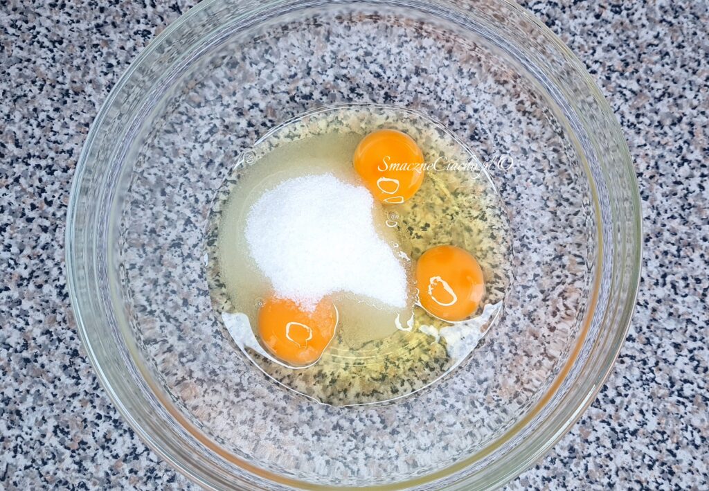 3. Do miski wbij jajka, wrzuć cukier i dodaj szczyptę soli. Ubijaj na najwyższej mocy miksera do momentu aż masa stanie się puszysta, jasna i potroi swoją objętość.