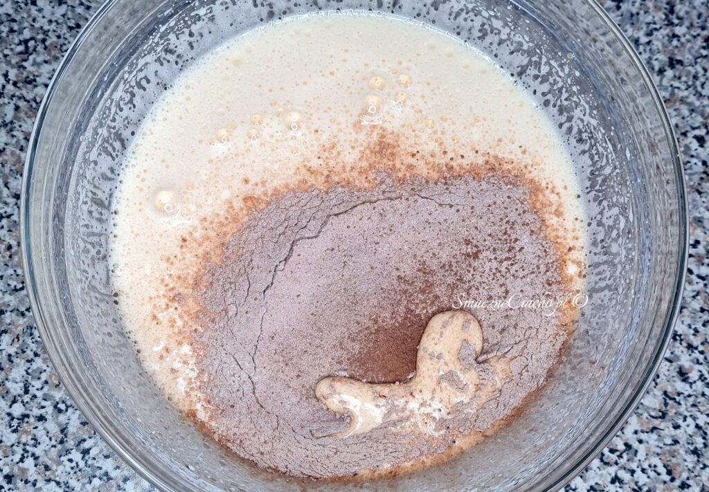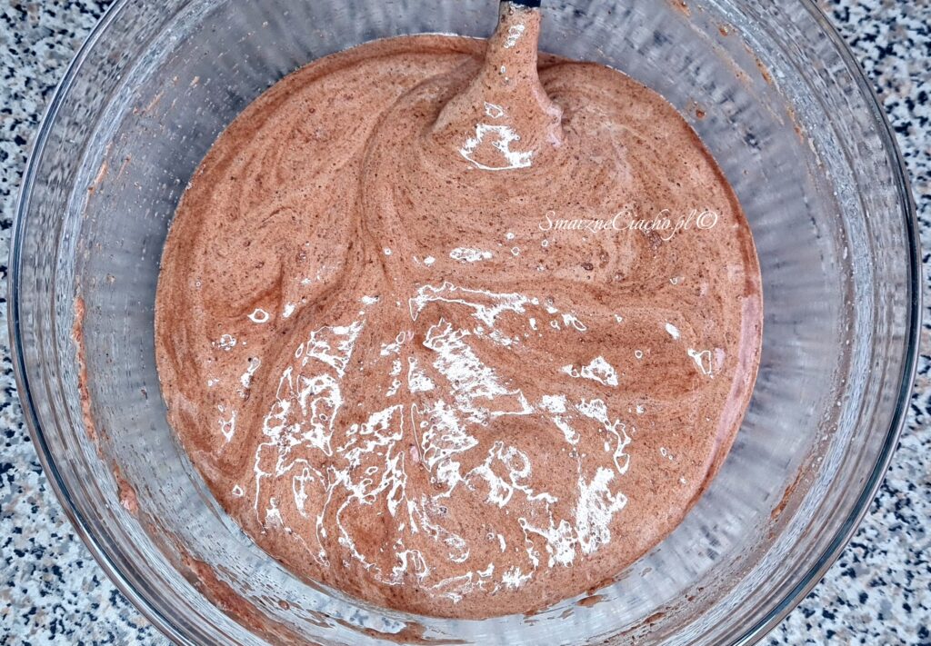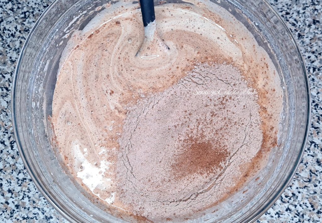 5. Połowę mąki z kakao i proszkiem przesiej do masy jajecznej i w miarę delikatnie wymieszaj szpatułką. Powtórz czynność z pozostałą częścią sypkich składników.