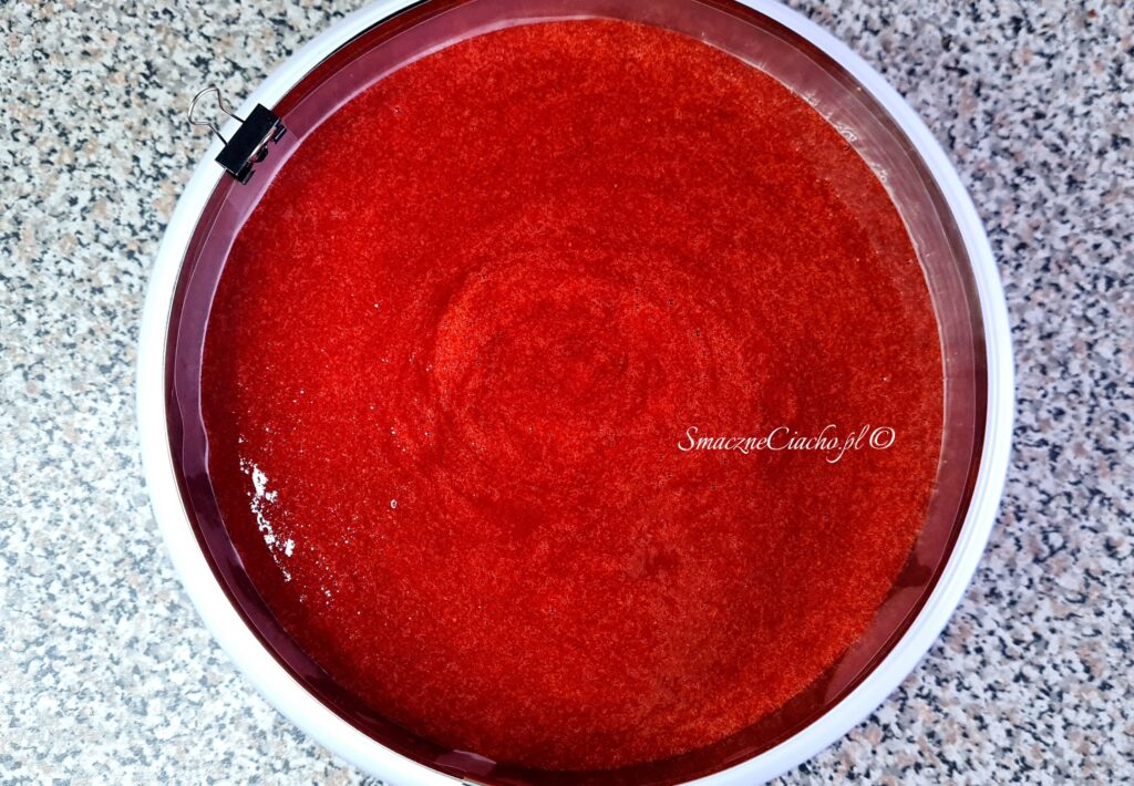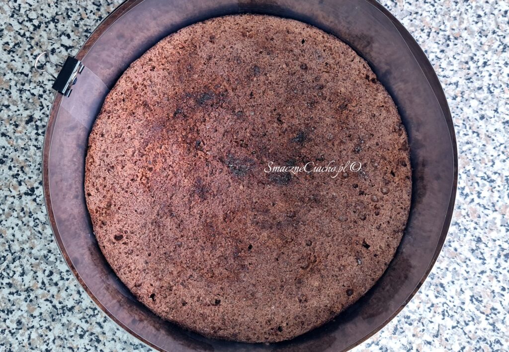 9. Biszkopt umieść ponownie na spodzie tortownicy, a boki uszczelnij folią rantową lub paskami folii spożywczej złożonej na kilka razy. Następnie nasącz biszkopt wodą lub herbatą.