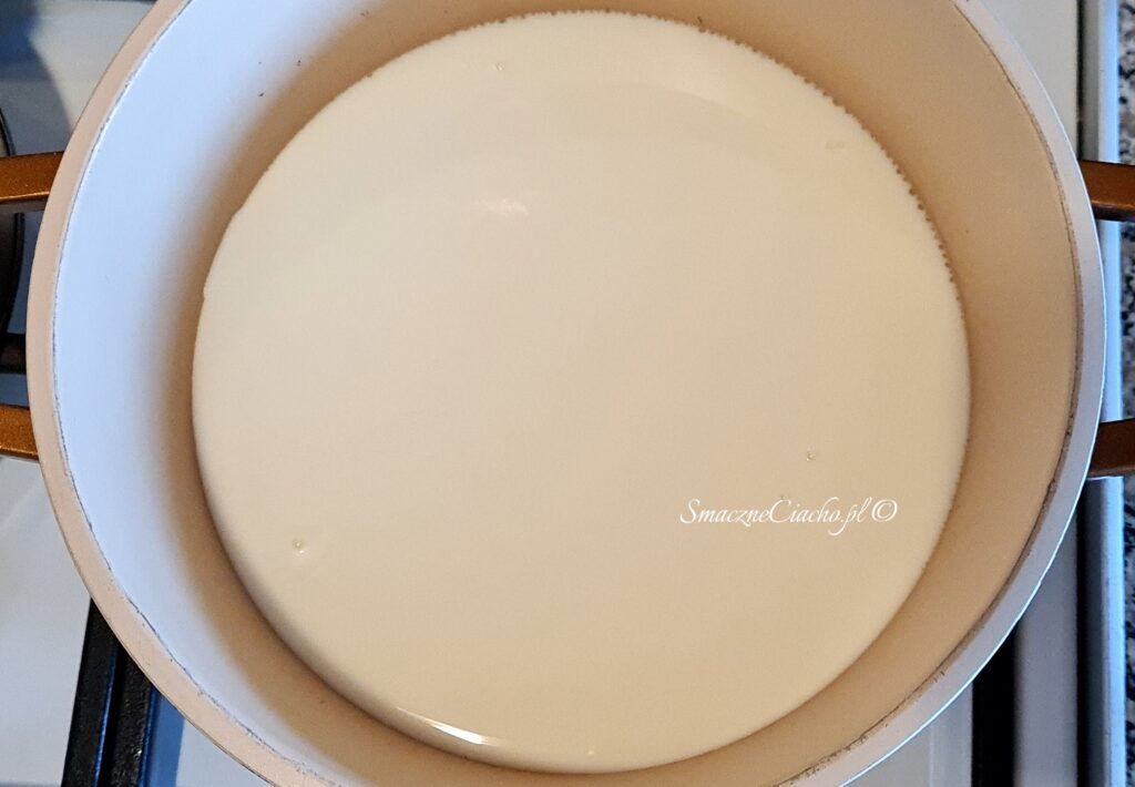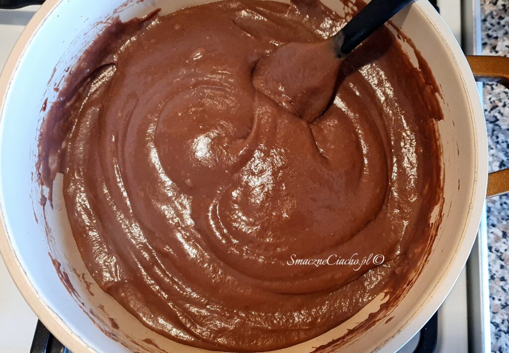 1. Proszek budyniowy, mąkę ziemniaczaną oraz cukier rozmieszaj w 300ml mleka. Pozostałe 500ml mleka zagotuj. Następnie odstaw z ognia, dodaj mieszankę z rozrobionym proszkiem szybko mieszając i ponownie ustaw na palniku. Cały czas mieszając ugotuj gęsty budyń czekoladowy.