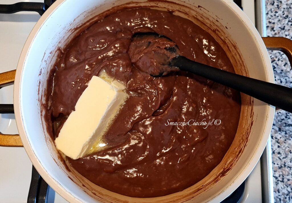 2. Następnie wrzuć masło i mieszając doprowadź do jego rozpuszczenia. Na koniec wymieszaj energicznie do połączenia tłuszczu z ugotowanym budyniem.