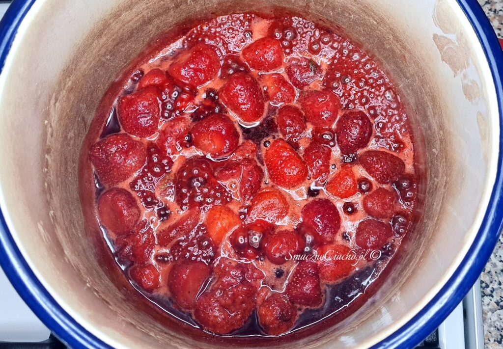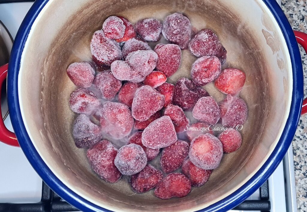1. Truskawki wrzuć do wyższego garnka i ustaw na palniku o mniejszym ogniu. Podgrzewaj owoce aż puszczą sok i zmiękną.