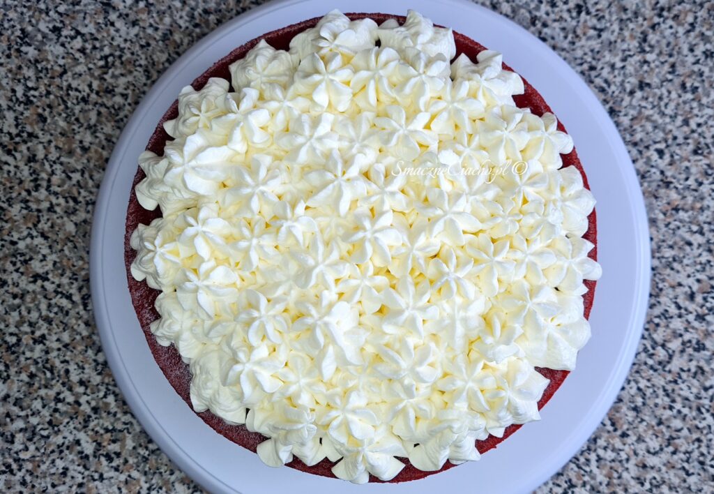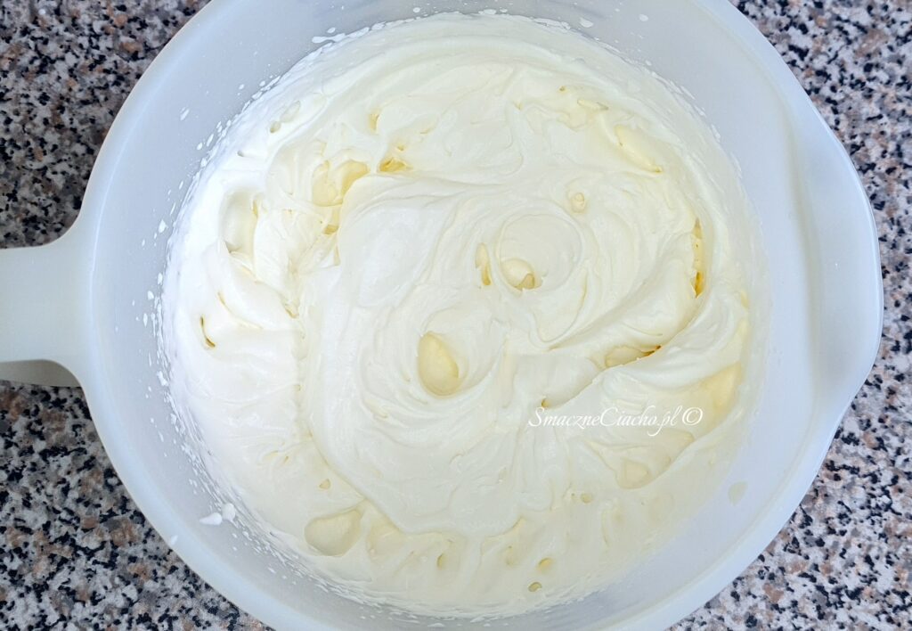 6. Na koniec do garnka lub wyższego naczynia wlej zimną śmietankę kremówkę, dodaj cukier puder i ewentualnie śmietan-fix. Ubijaj do momentu aż wzory po mieszadłach będą wyraźnie widoczne, a śmietanka nie będzie się przemieszczać po przechyleniu naczynia. Udekoruj tort. (Można również wyłożyć śmietankę na wierzch, wyrównać i posypać startą czekoladą).