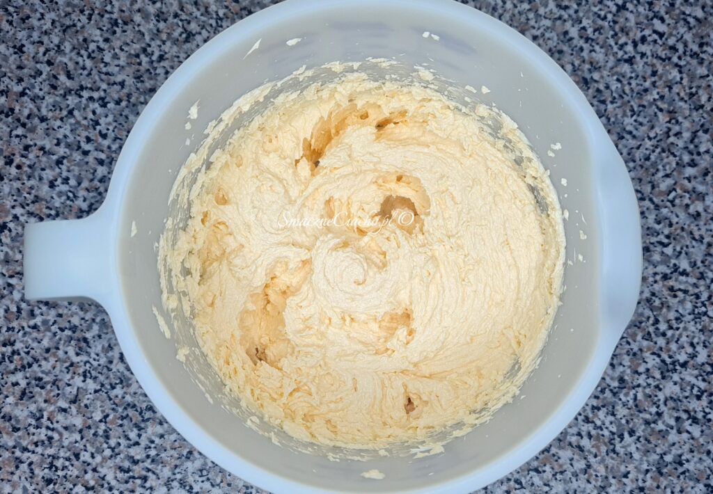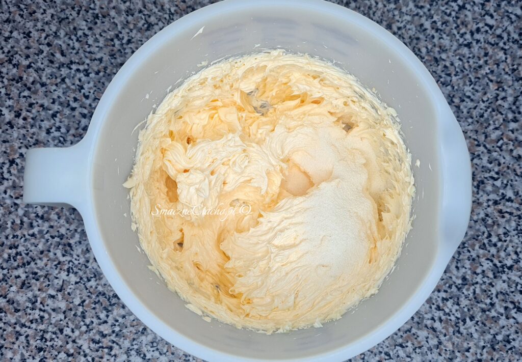 5. Następnie zmniejsz obroty miksera do 2 stopnia i dosypuj partiami kaszę mannę. Dobrze wymieszaj na koniec.