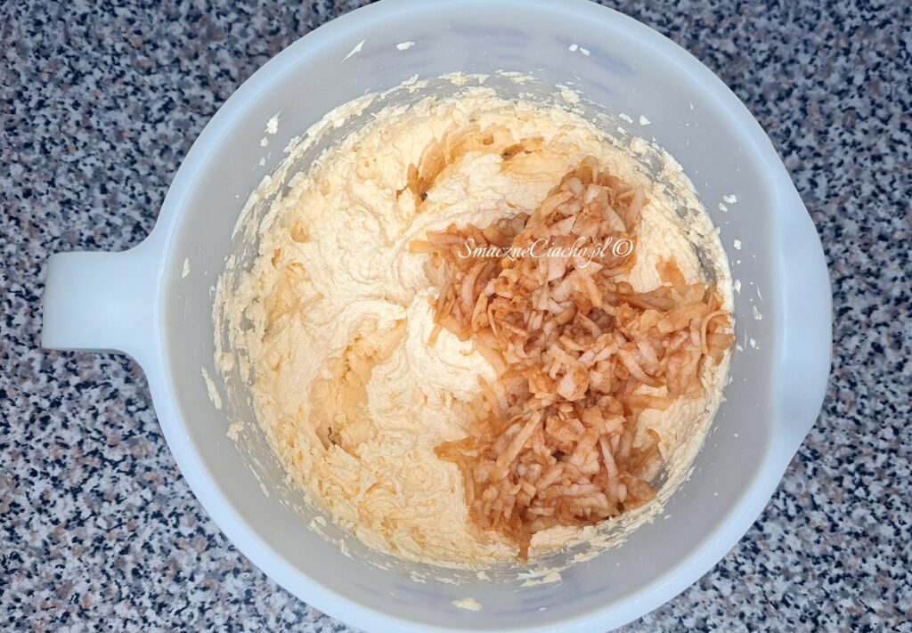 6. Teraz dodaj starte, odciśnięte jabłka w 3-4 partiach i każdą dobrze wymieszaj mikserem.