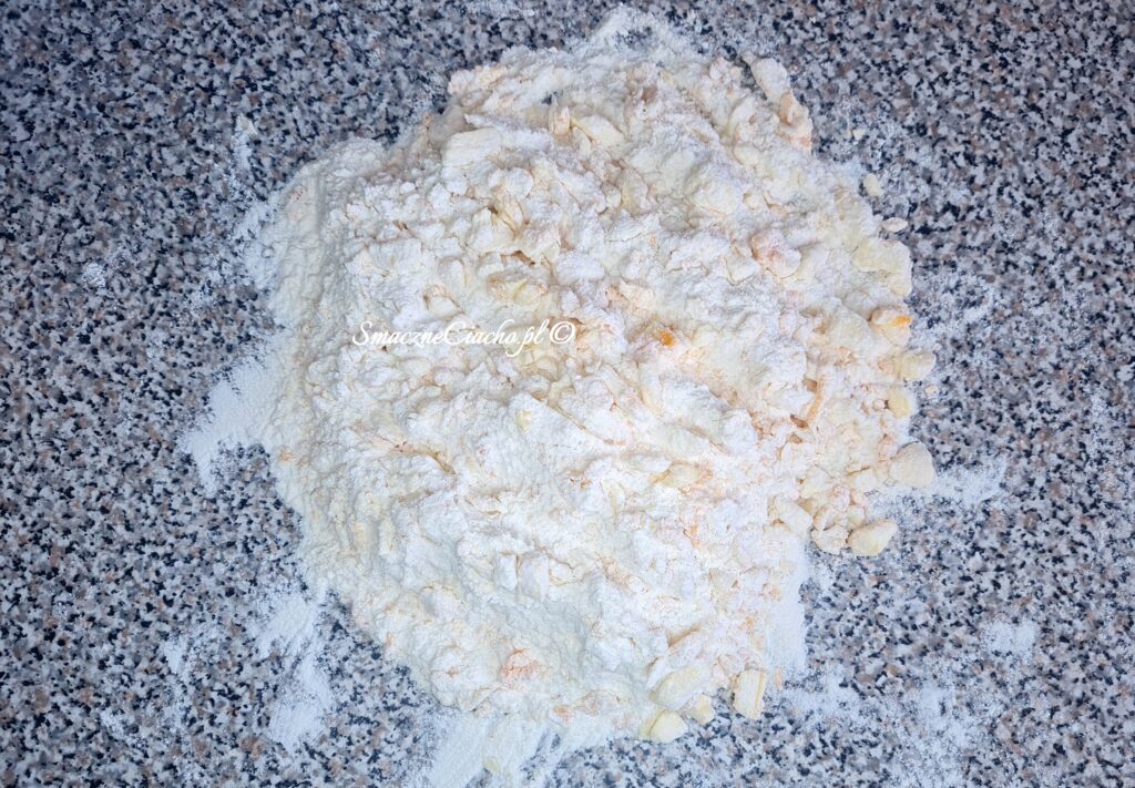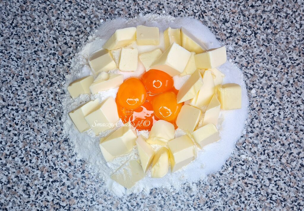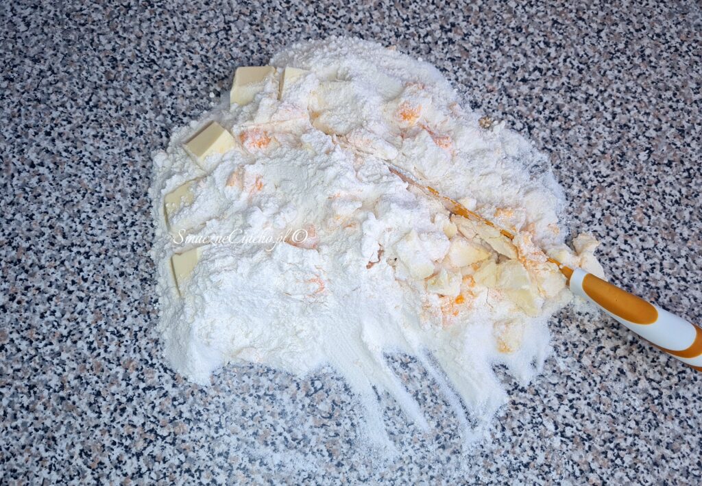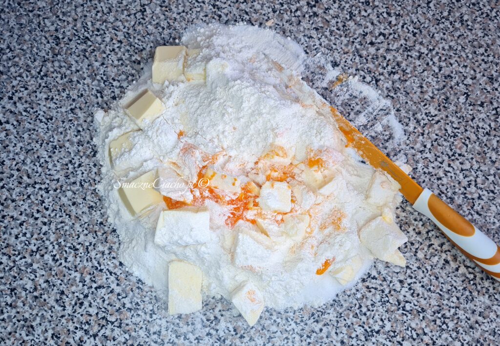 1. Na czysty blat wysyp mąkę, drobny cukier i cukier wanilinowy. Dodaj żółtka i kawałki masła. Posiekaj nożem aby wstępnie zmieszać składniki.
