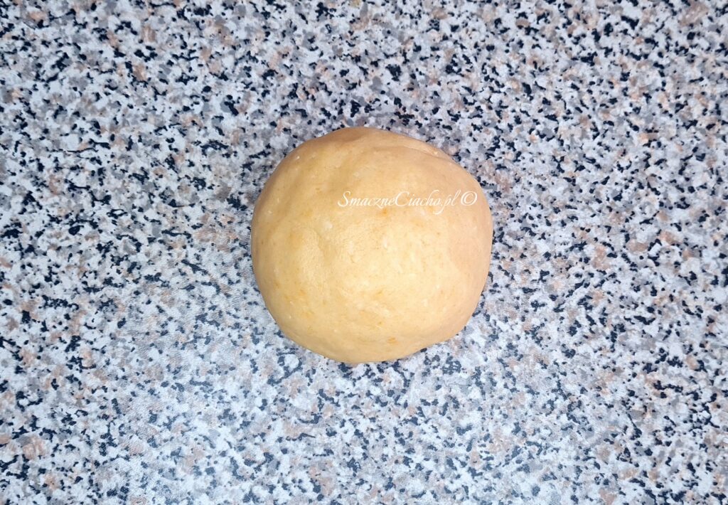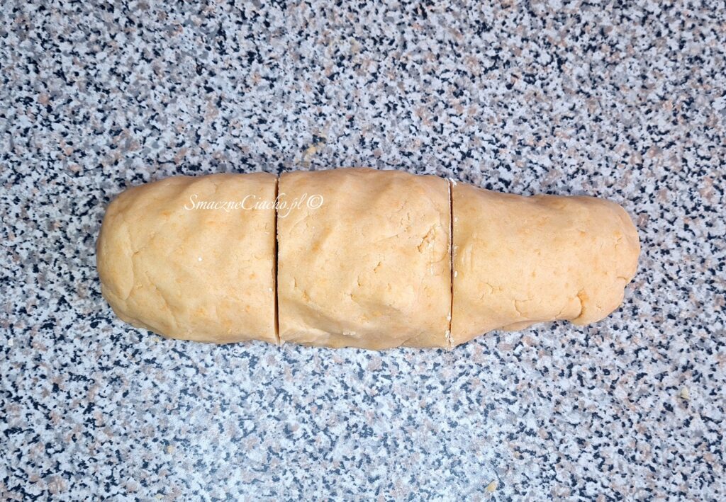 2. Następnie zagnieć ciasto i podziel je na 3 części. 2 trochę większe (na spód użyję środkowej części) i 1 mniejszą (wierzch).
