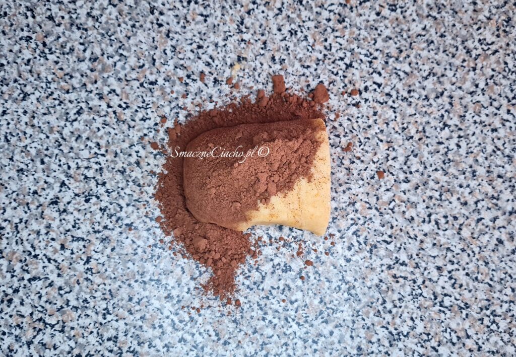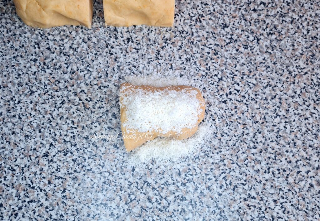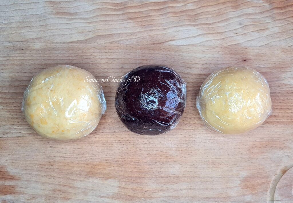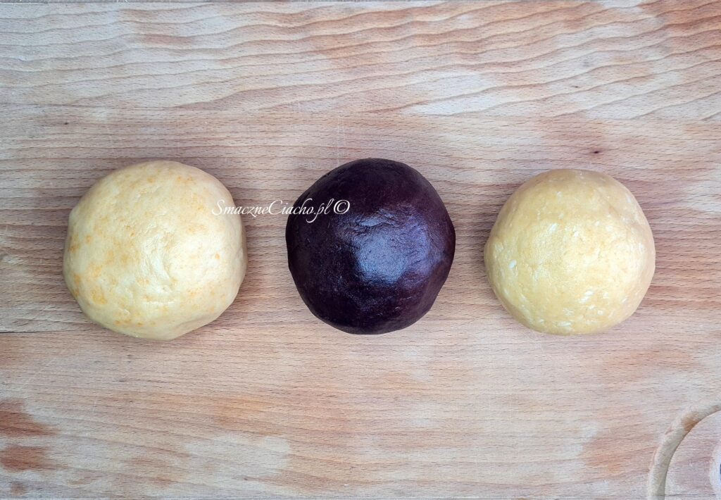3. Mniejszą część ciasta zagnieć z wiórkami kokosowymi. Natomiast jedną z większych części ciasta zagnieć z kakao. Każdą część ciasta owiń w folię spożywczą i włóż do lodówki na minimum 60 minut. (W lodówce ciasto schłodzi się równomiernie. Jeżeli włożysz do zamrażalnika na krótszy okres czasu, ciasto będzie twarde na wierzchu i jeszcze miękkie w środku).