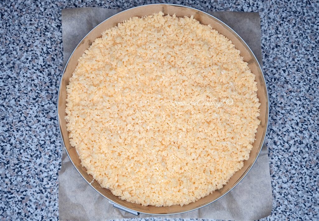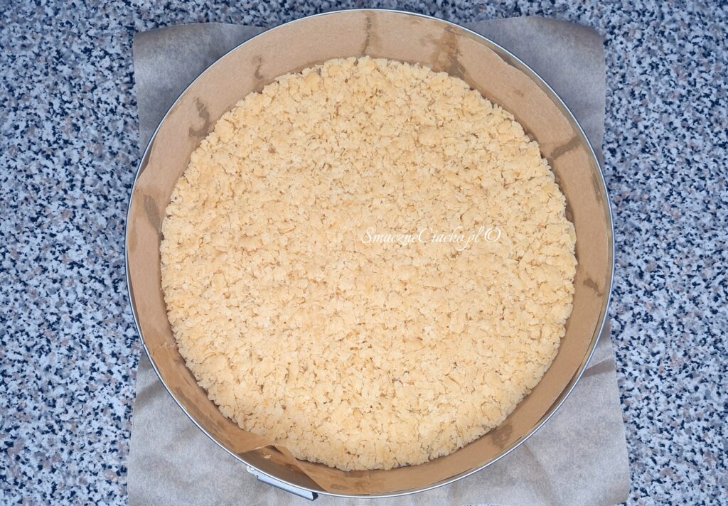 2. Większą, jasną część ciasta zetrzyj na tarce (najwygodniej jest na talerz) lub pokrusz i wysyp na spód tortownicy. Lekko dociśnij dłonią aby później było łatwiej rozprowadzić konfiturę.