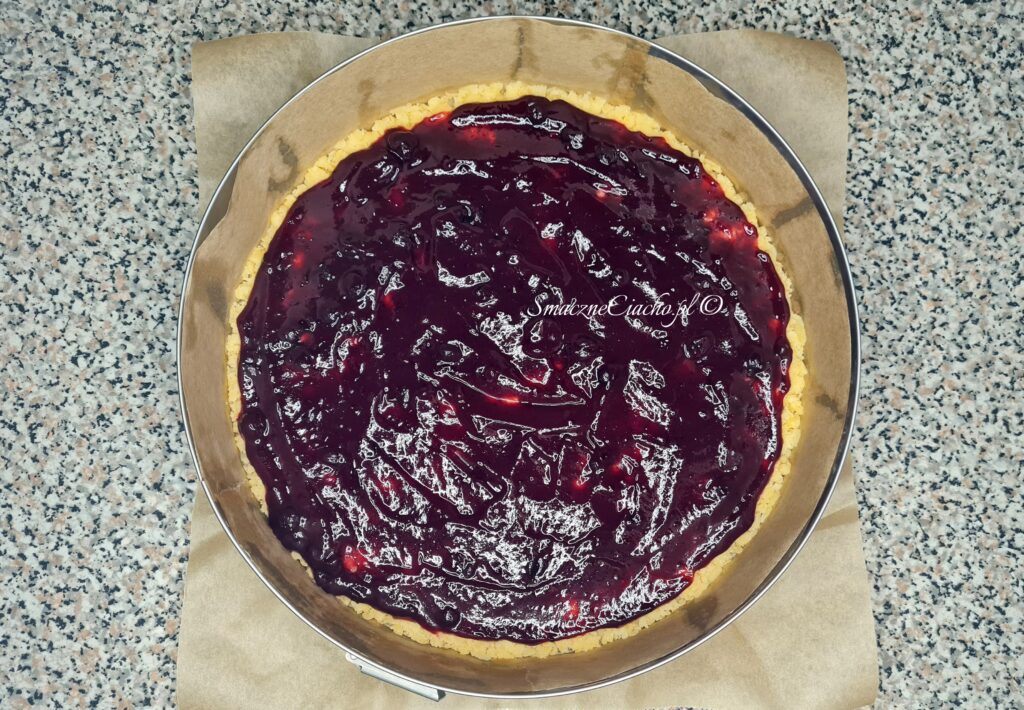 3. Na jasny spód wyłóż konfiturę lub powidła i przykryj je warstwą startego lub pokruszonego ciemnego ciasta.