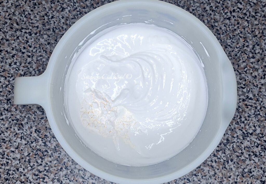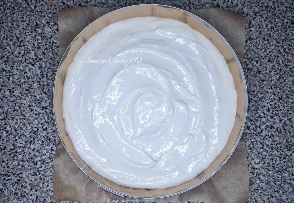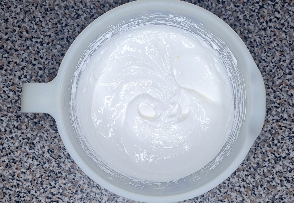 4. Beza: Białka, w temperaturze pokojowej, ubij mikserem ze szczyptą soli dodając partiami drobny cukier. Gdy cukier się rozpuści, dodaj płaską łyżkę mąki lub budyniu czy kisielu i zmiksuj do połączenia. Wyłóż na ciemne ciasto.