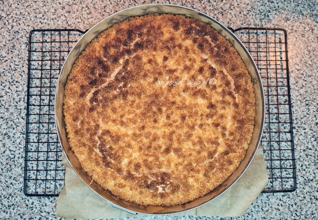 5. Na wierzch zetrzyj na tarce lub pokrusz ostatnią, kokosową część ciasta. Wstaw tortownicę do nagrzanego piekarnika i piecz ok. 45 minut, do zrumienienia wierzchu.