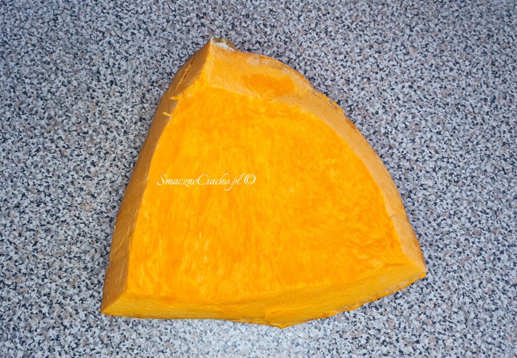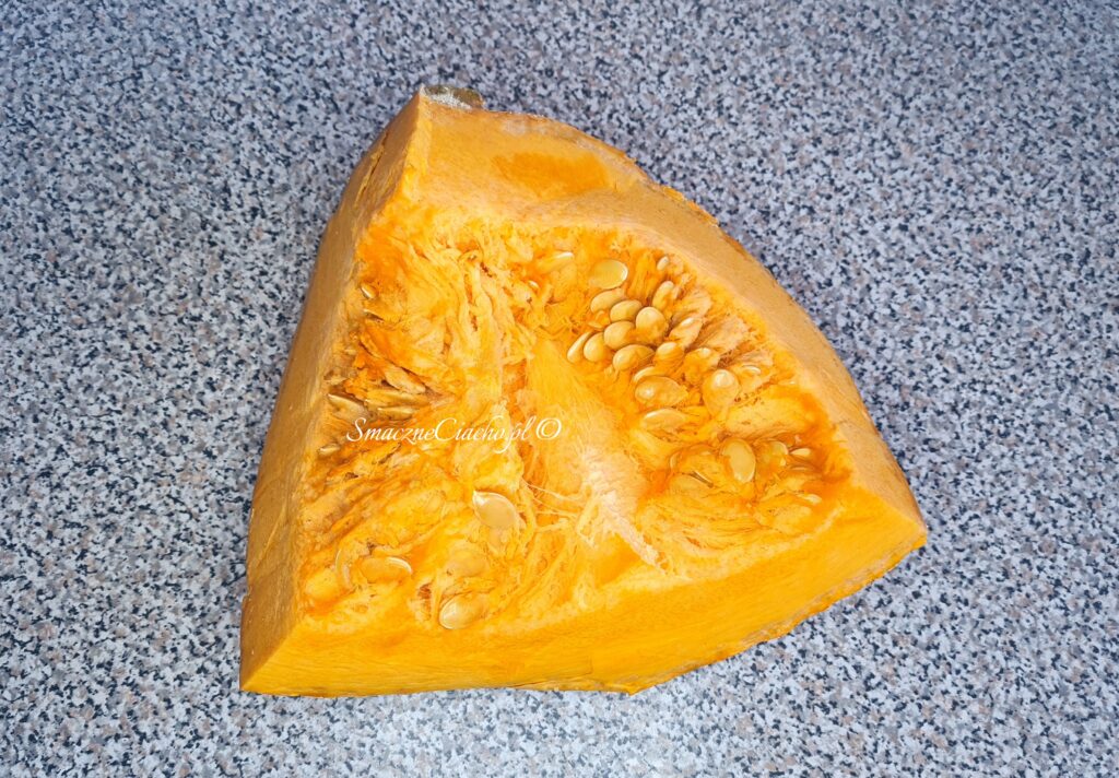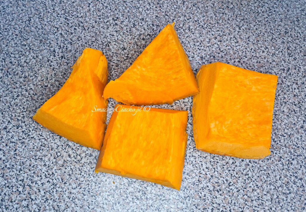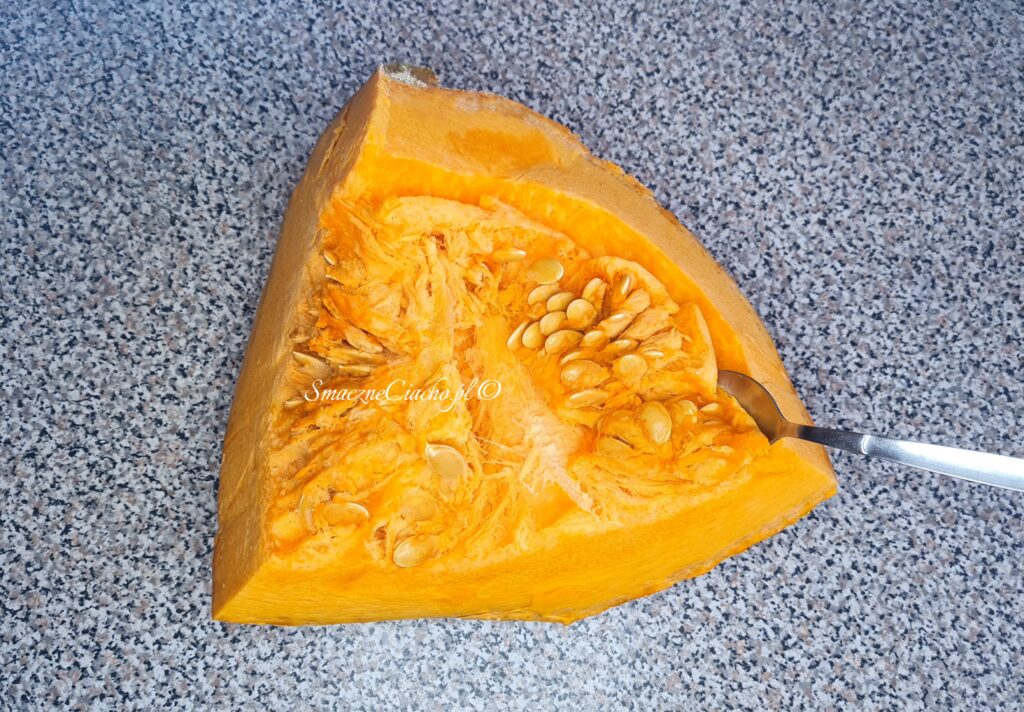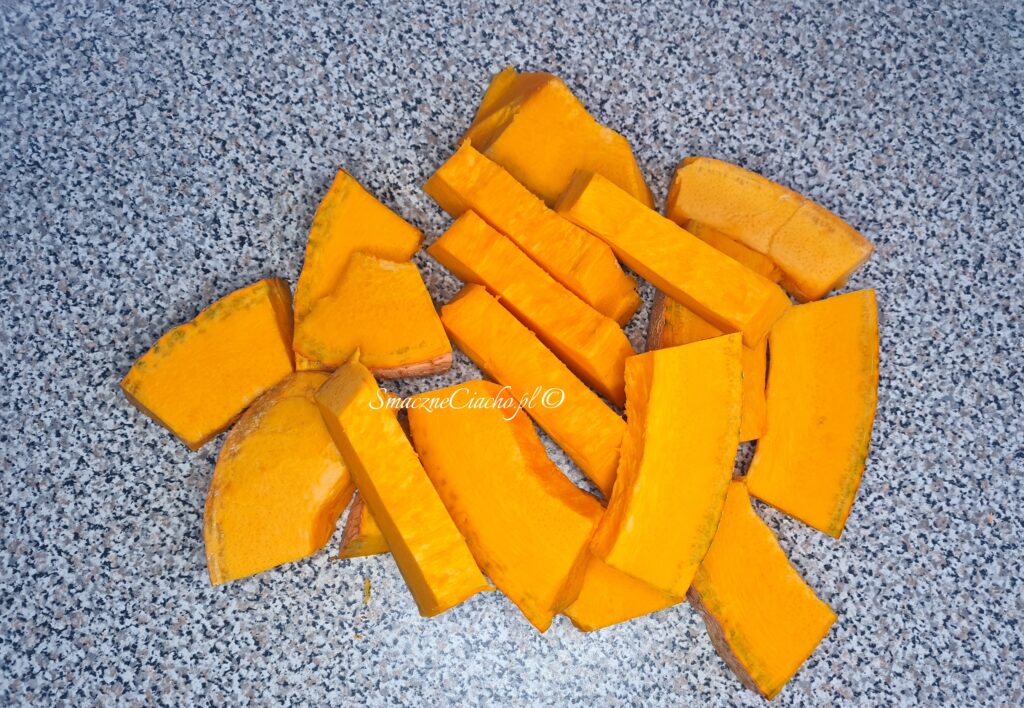 2. Dynię wypestkuj łyżką i pokrój na mniejsze części, najlepiej dużym nożem, a następnie w plastry grubości 3-4cm. (Jeżeli będą grubsze, nic nie szkodzi).