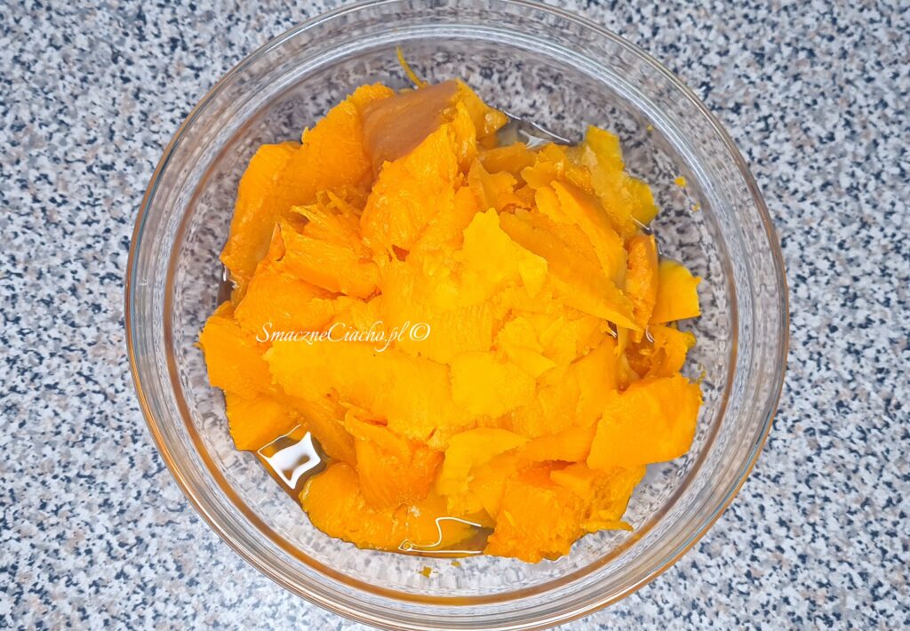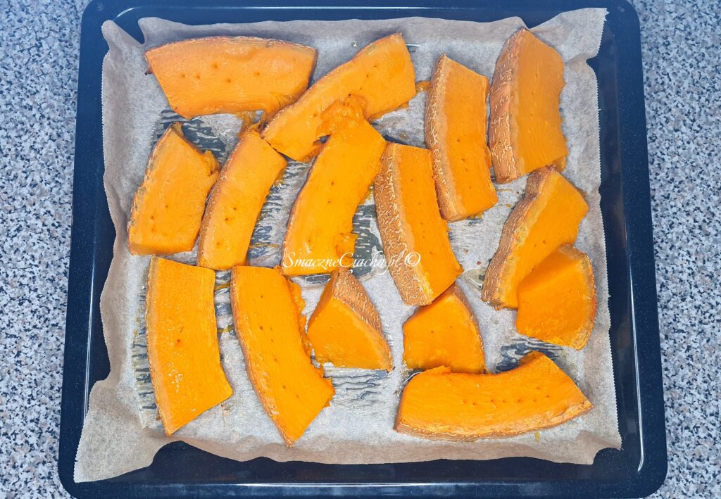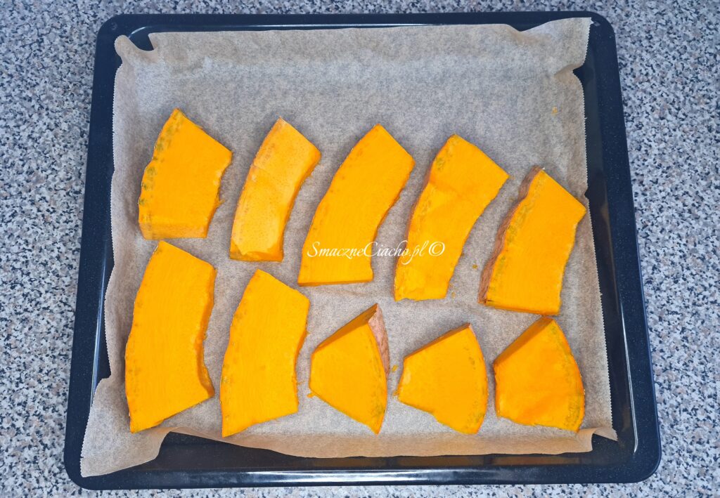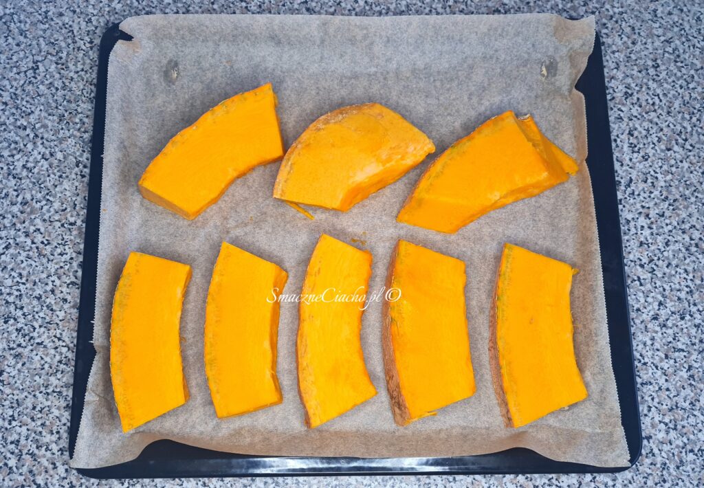 4. Piekarnik nagrzej do 160°C z termoobiegiem lub 180°C grzałka góra-dół. Następnie wstaw dynię i piecz 20-30 minut, do momentu aż miąższ dyni, po nakłuciu patyczkiem, będzie miękki.