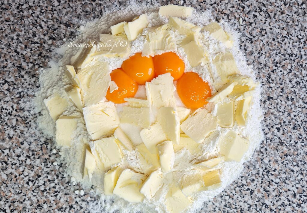 2. Mąkę, proszek do pieczenia i cukry wysyp na blat, dodaj żółtka oraz pokrojone masło. Posiekaj wszystko nożem aż dobrze się połączy lub rozetrzyj w dłoniach jak kruszonkę 🙂