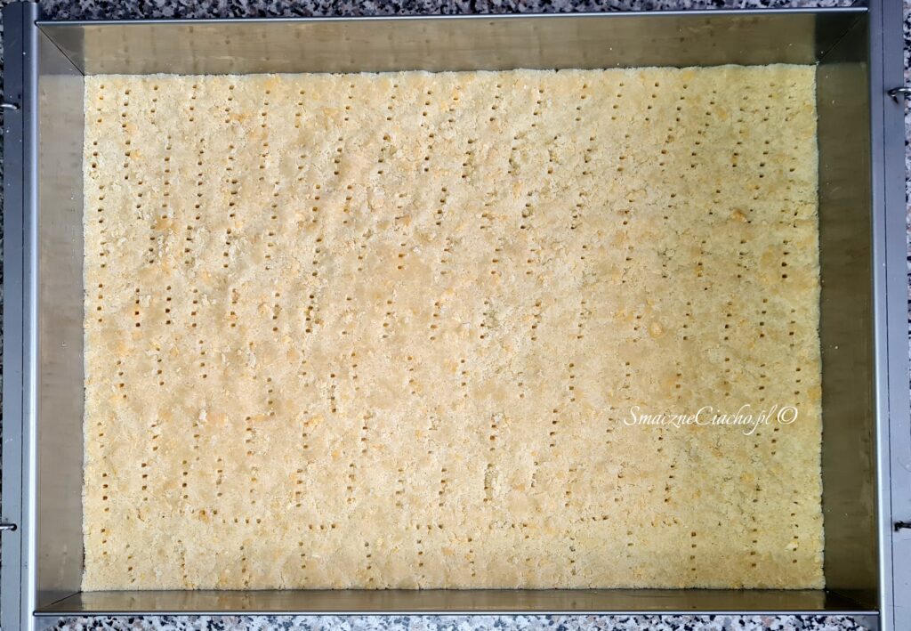 3. Około 2/3 ciasta przesyp do formy i wylep nim spód. Następnie ponakłuwaj widelcem. Resztę ciasta przełóż do woreczka lub owiń folią spożywczą i włóż do lodówki.