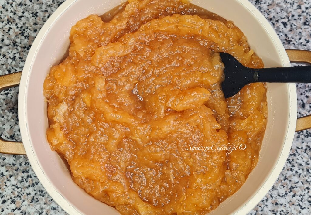 (Jeżeli jabłka puściły dużo soku, można je podgrzewać dalej aż odparuje i pozostanie mus jabłkowy. Można również sok odlać, a jabłka wymieszać z łyżką skrobi/mąki ziemniaczanej lub kukurydzianej).