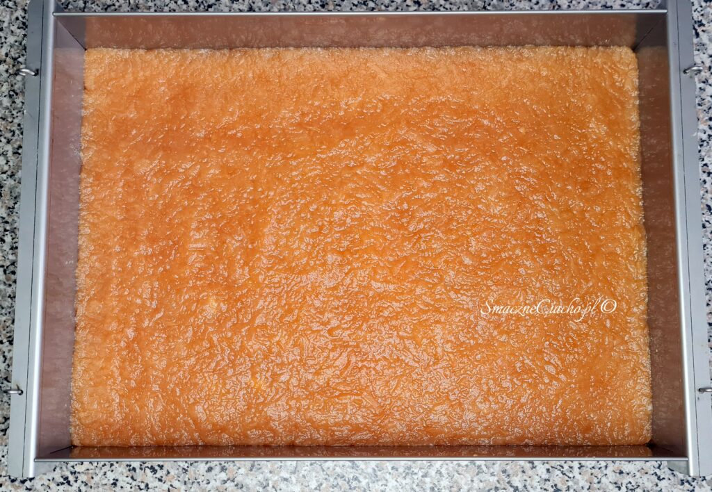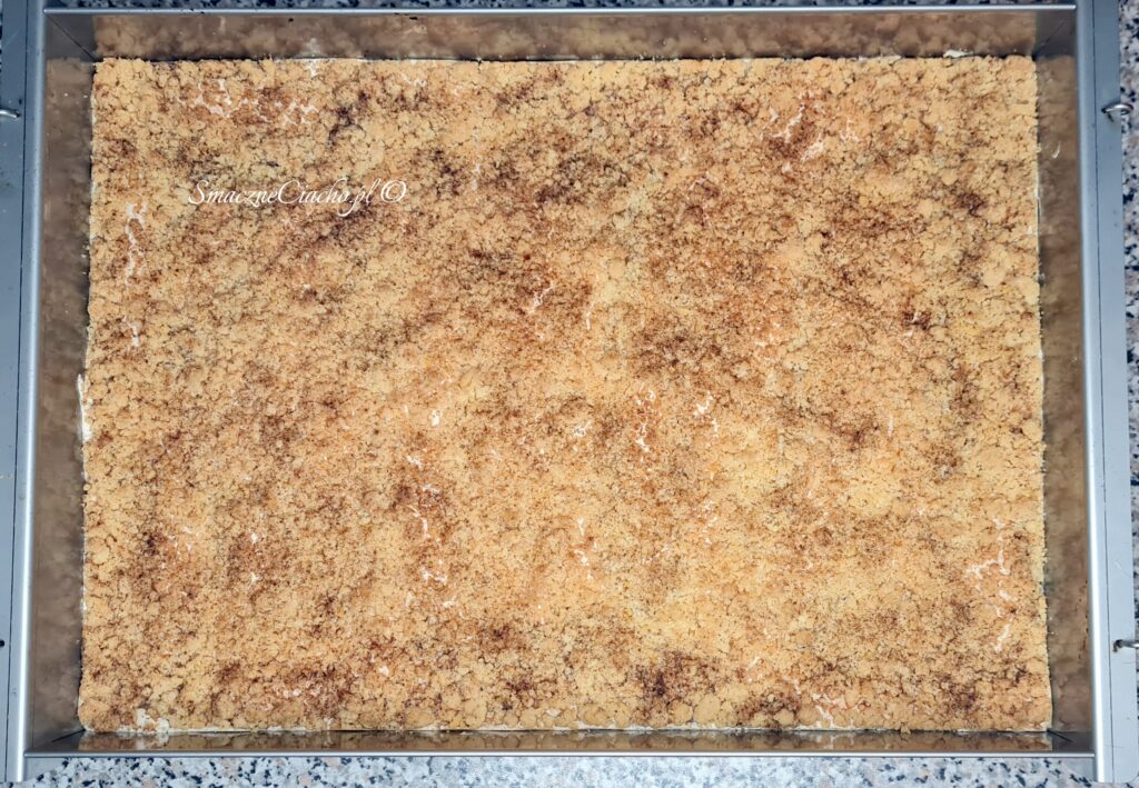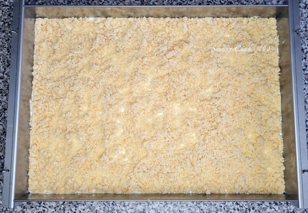 5. Formę z podpieczonym spodem wyjmij z piekarnika i posyp wierzch ciasta bułką tartą lub kaszą manną (pomoże to w zachowaniu kruchości ciasta).