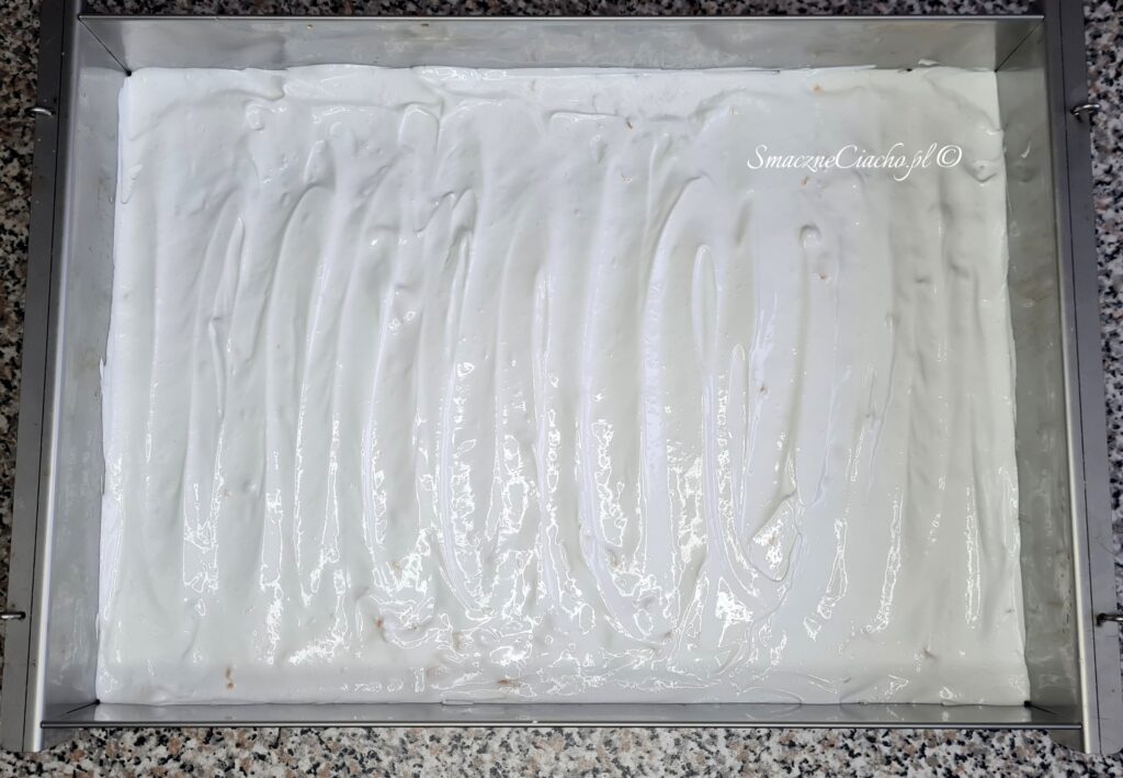 2. Białka ubij z cukrem na sztywno. Dodaj mąkę ziemniaczaną i krótko zmiksuj do połączenia. Wyłóż piankę bezową na warstwę jabłek. (Można pominąć).
