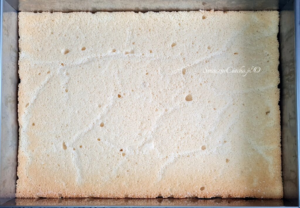 5. Ciasto biszkoptowe przełóż do formy, wyrównaj i piecz 30 minut, do zrumienienia wierzchu i suchego patyczka.