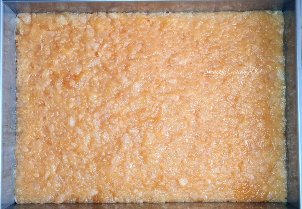3. Gdy mus jabłkowy zrobi się mocno ciepły i zgęstnieje, wyłóż go porcjami na biszkopt i wyrównaj. Pozostaw biszkopt z warstwą jabłkową na blacie na około 30 minut aż mus dobrze wystygnie. (Dla pewności można dodatkowo wstawić do lodówki na minimum 30 minut).