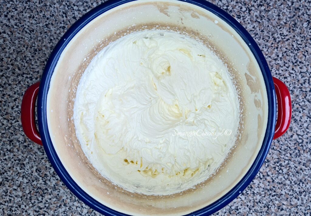2. Zimną śmietankę kremówkę wlej do wyższego naczynia, np. garnka, dodaj cukier puder i ubijaj na najwyższej mocy miksera aż wzory po mieszadłach będą już wyraźnie widoczne, a śmietana nie będzie się przemieszczać po przechyleniu garnka.