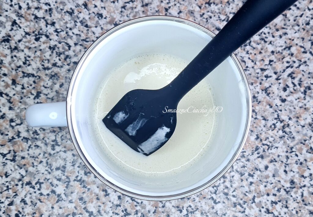 4. Do ciepłej i rozpuszczonej żelatyny dodaj łyżkę ubitej śmietanki i szybko wymieszaj (hartowanie żelatyny, aby zapobiec powstaniu grudek w bitej śmietanie). Pomiń, jeżeli użyjesz śmietanki 36%.