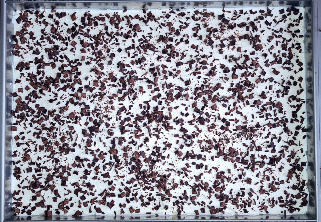 6. Wyłóż ubitą śmietankę na jabłka i wyrównaj. Dla dekoracji posyp np. startą gorzką lub deserową czekoladą lub wiórkami czekoladowymi.